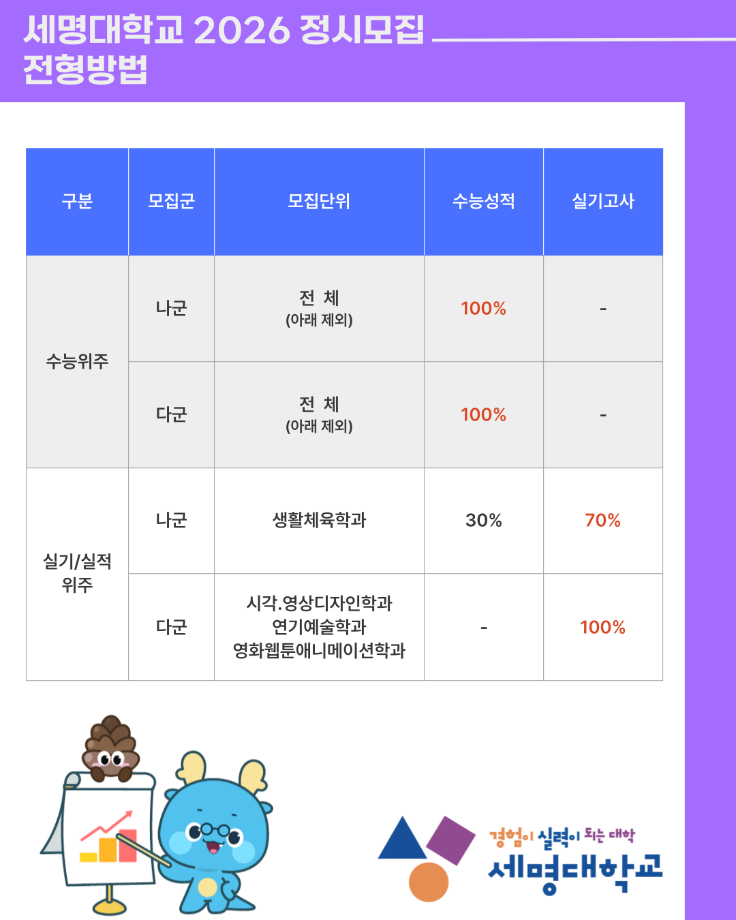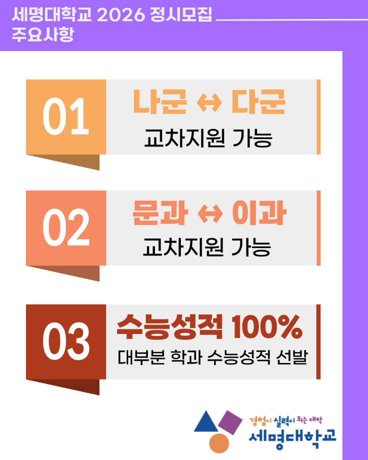 본문 시작 홈으로 SMIT 소식 SMIT 소개 SMIT 교육 SMIT 취업 SMIT 소식 SMIT 입학 홈페이지가이드 갤러리 공지사항 갤러리 경진대회 동아리 갤러리 페이스북 트위터 프린트 2026 정시모집 안내 스마트IT학부 44 2025-12-29 2026 정시모집 안내 목록 이전2026학년도 수시모집 최초합격자 등록안내 다음 📢2026 정시모집 + 스마트IT학부의 각종활동📢 담당부서 : 스마트IT학부 담당자 : - 연락처 : 043-649-1275 최종수정일 : 2024-10-26 만족도조사 만족도 조사 이 페이지에서 제공하는 정보에 대하여 만족하시나요? 매우만족 만족 보통 불만족 매우불만족