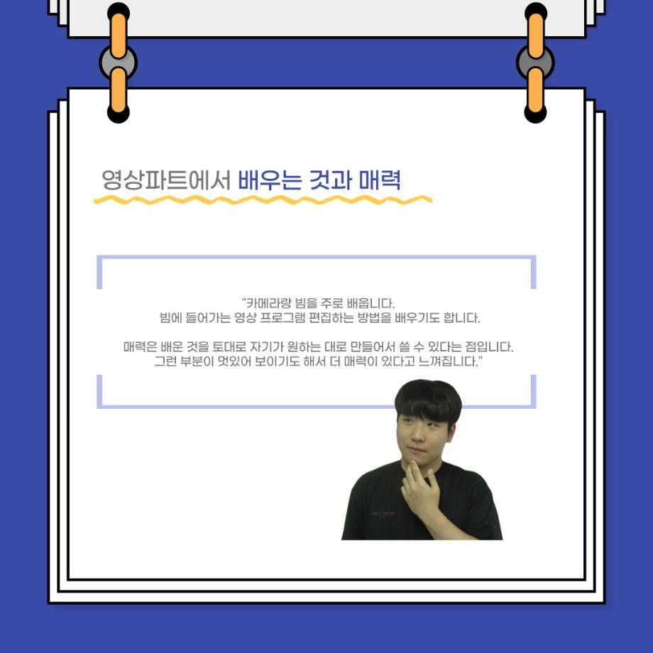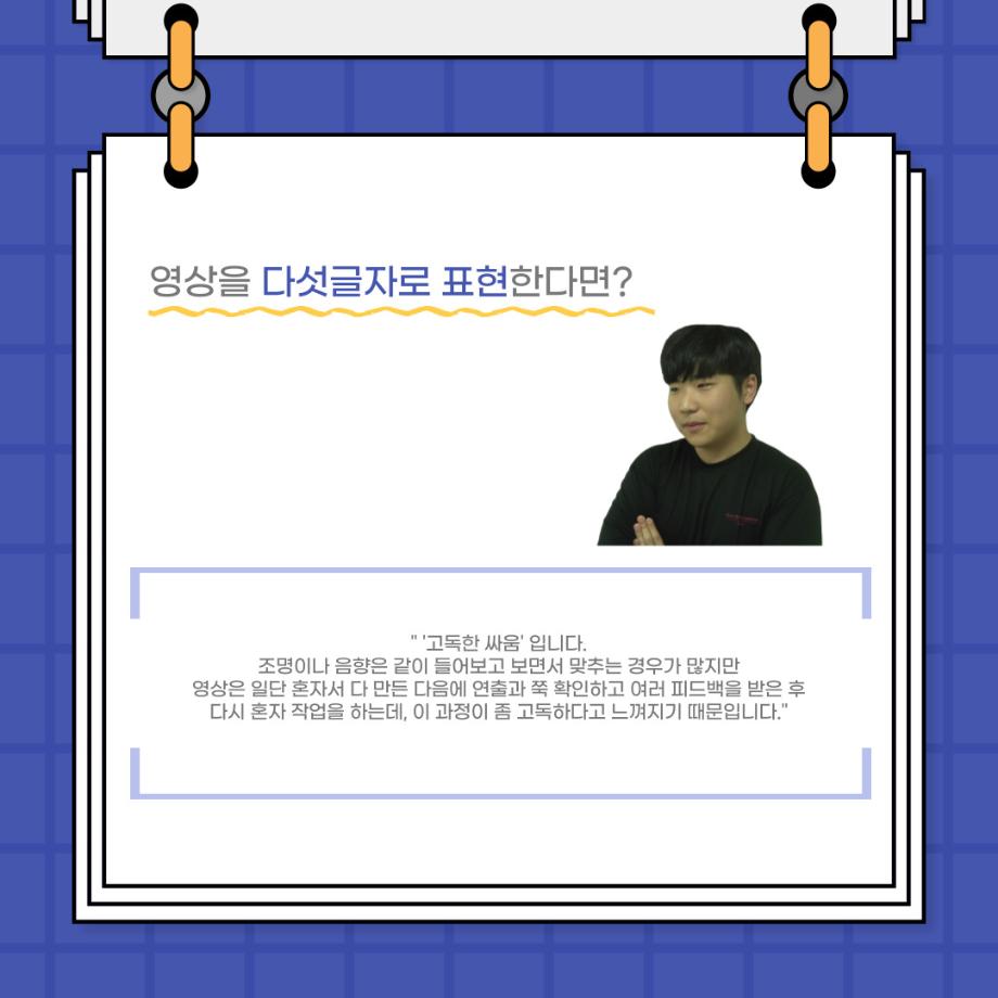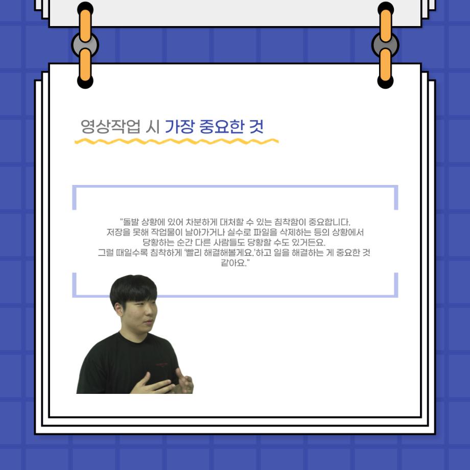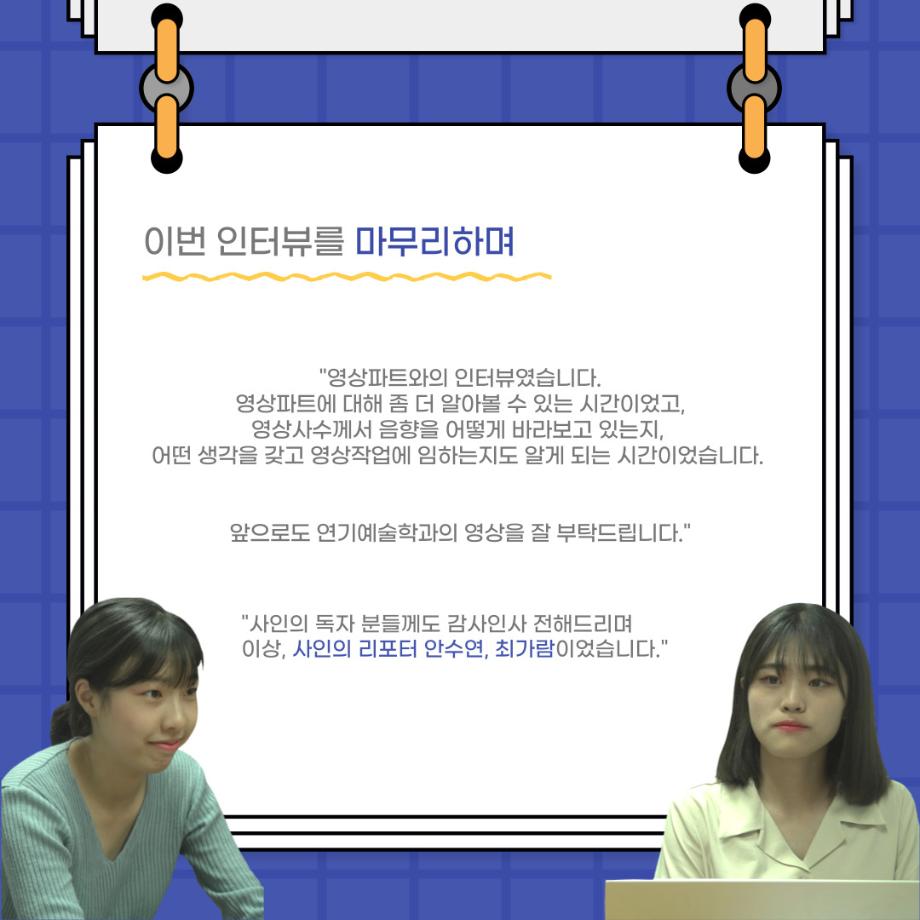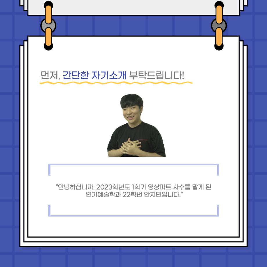 본문 시작 홈으로 커뮤니티 학과소개 입학정보 교수소개 학과과정 커뮤니티 공연예매 안내 홈페이지가이드 포토갤러리 공지사항 포토갤러리 작품DB 동아리 학사일정 학생회 포토갤러리 페이스북 트위터 프린트 사이와의 인터뷰 - 23년도 영상사수 ‘안지민‘ 연기예술학과 3706 2023-10-13 안녕하십니까. 23년도 학회 ‘사이’입니다. 학회 ‘사이’의 열번째 인터뷰로 연기예술학과 23년도 1학기 영상 사수인 안지민 학생과 인터뷰하는 시간을 가졌습니다. 이번 인터뷰에서는 영상 파트의 매력과 영상 작업시 가장 중요한 것, 영상 작업에서 알아두어야 하는 것 등에 대해 인터뷰하였습니다. 다음 인터뷰 컨텐츠 ‘사인’도 많은 사랑 부탁드립니다. 목록 이전사이와의 인터뷰 - 23년도 영상장 ‘양희진‘ 다음 2024학년도 세명대학교 연기예술학과 수시 진행 담당부서 : 연기예술학과 담당자 : - 연락처 : 043-649-1733 최종수정일 : 2024-10-26 만족도조사 만족도 조사 이 페이지에서 제공하는 정보에 대하여 만족하시나요? 매우만족 만족 보통 불만족 매우불만족