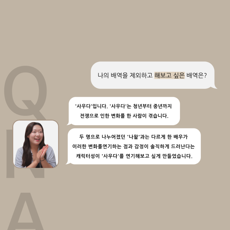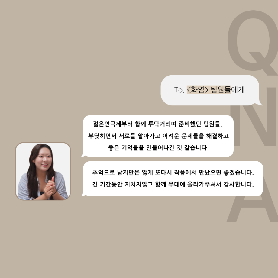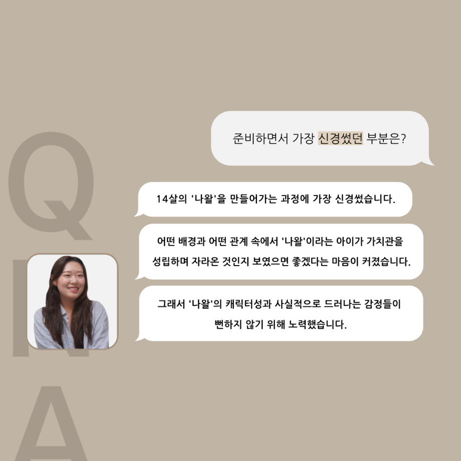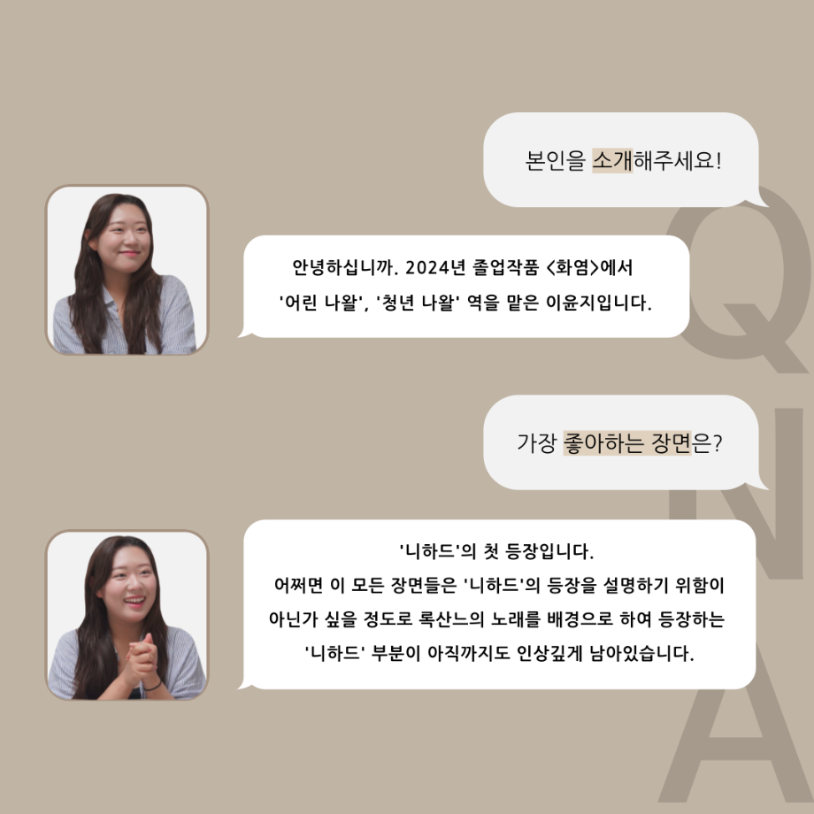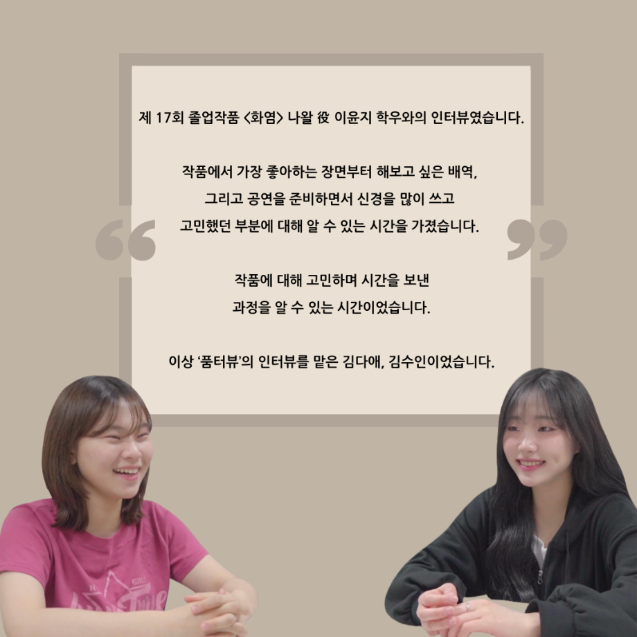 본문 시작 홈으로 커뮤니티 학과소개 입학정보 교수소개 학과과정 커뮤니티 공연예매 안내 홈페이지가이드 포토갤러리 공지사항 포토갤러리 작품DB 동아리 학사일정 학생회 포토갤러리 페이스북 트위터 프린트 ‘품’위있는 인‘터뷰’ - 24년도 졸업작품 어린나왈 役 <이윤지> 연기예술학과 2980 2024-12-19 안녕하십니까. 24년도 학회 ‘품’ 입니다. 학회 ‘품’의 열 일곱 번째 인터뷰로 세명대학교 연기예술학과 제 17회 졸업작품 <화염>의 어린 나왈 역인 이윤지 학우와 인터뷰 하는 시간을 가졌습니다. 가장 좋아하는 장면, 자신의 배역을 제외하고 해보고 싶은 배역 그리고 준비하면서 어려웠던 부분과 공연을 마친 소감 등에 대해 인터뷰 하는 시간을 가졌습니다. 앞으로 있을 인터뷰 컨텐츠인 ‘품터뷰’ 많은 사랑 부탁드립니다. 목록 이전세명대학교 연기예술학과 종강총회 다음 ‘품’위있는 인‘터뷰’ - 24년도 졸업작품 르벨 役 <정성주> 담당부서 : 연기예술학과 담당자 : - 연락처 : 043-649-1733 최종수정일 : 2024-10-26 만족도조사 만족도 조사 이 페이지에서 제공하는 정보에 대하여 만족하시나요? 매우만족 만족 보통 불만족 매우불만족