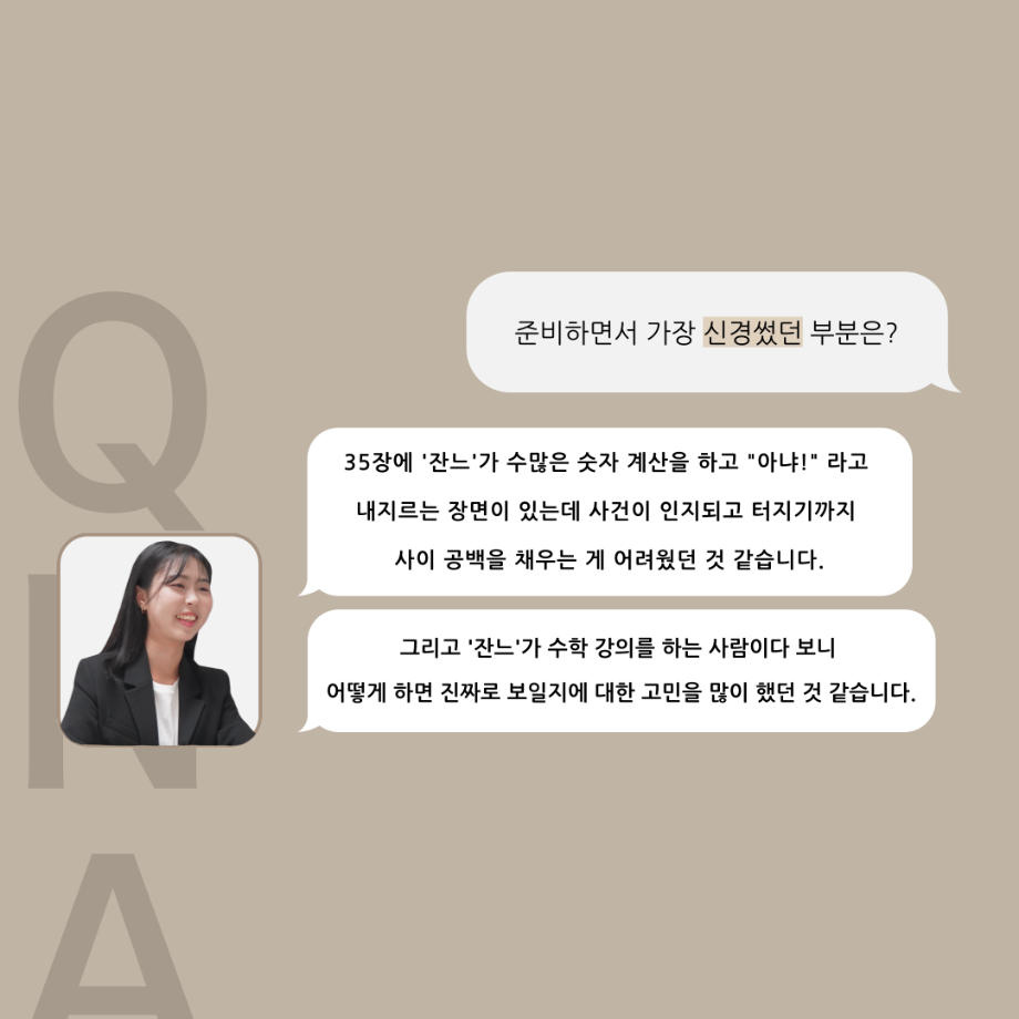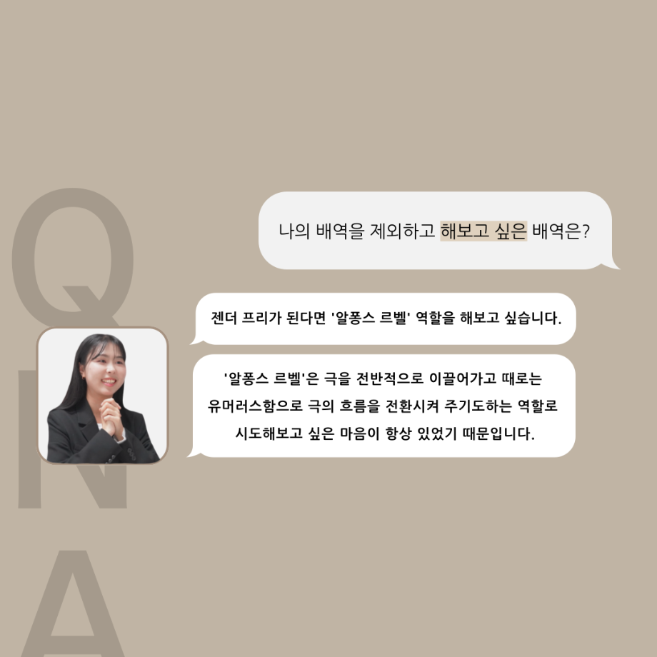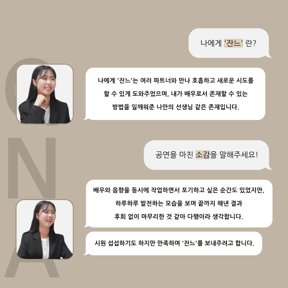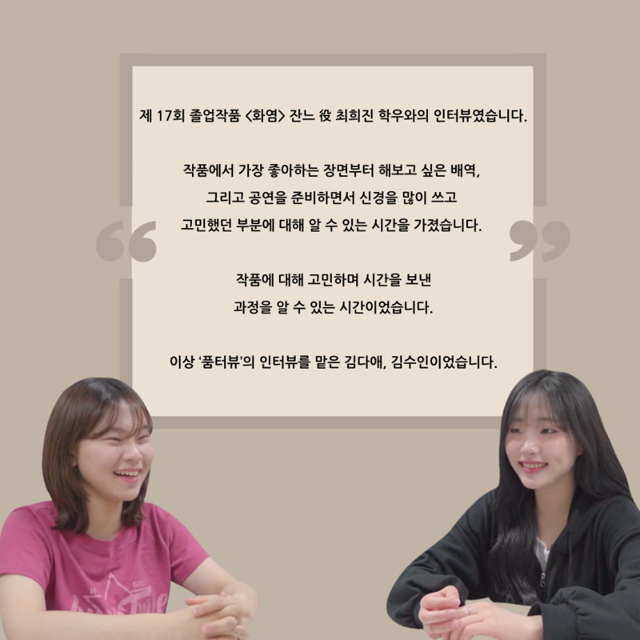 본문 시작 홈으로 커뮤니티 학과소개 입학정보 교수소개 학과과정 커뮤니티 공연예매 안내 홈페이지가이드 포토갤러리 공지사항 포토갤러리 작품DB 동아리 학사일정 학생회 포토갤러리 페이스북 트위터 프린트 ‘품’위있는 인‘터뷰’ - 24년도 졸업작품 잔느 役 <최희진> 연기예술학과 3113 2024-12-23 안녕하십니까. 24년도 학회 ‘품’ 입니다. 학회 ‘품’의 열 아홉 번째 인터뷰로 세명대학교 연기예술학과 제 17회 졸업작품 <화염>의 잔느 역인 최희진 학우와 인터뷰 하는 시간을 가졌습니다. 가장 좋아하는 장면, 자신의 배역을 제외하고 해보고 싶은 배역 그리고 준비하면서 어려웠던 부분과 공연을 마친 소감 등에 대해 인터뷰 하는 시간을 가졌습니다. 앞으로 있을 인터뷰 컨텐츠인 ‘품터뷰’ 많은 사랑 부탁드립니다. 목록 이전‘품’위있는 인‘터뷰’ - 24년도 졸업작품 르벨 役 <정성주> 다음 ‘품’위있는 인‘터뷰’ - 24년도 졸업작품 시몽 役 <이종화> 담당부서 : 연기예술학과 담당자 : - 연락처 : 043-649-1733 최종수정일 : 2024-10-26 만족도조사 만족도 조사 이 페이지에서 제공하는 정보에 대하여 만족하시나요? 매우만족 만족 보통 불만족 매우불만족