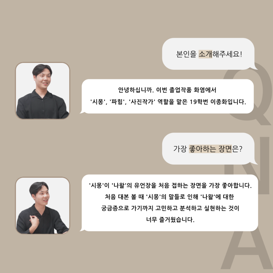 본문 시작 홈으로 커뮤니티 학과소개 입학정보 교수소개 학과과정 커뮤니티 공연예매 안내 홈페이지가이드 포토갤러리 공지사항 포토갤러리 작품DB 동아리 학사일정 학생회 포토갤러리 페이스북 트위터 프린트 ‘품’위있는 인‘터뷰’ - 24년도 졸업작품 시몽 役 <이종화> 연기예술학과 3133 2024-12-24 안녕하십니까. 24년도 학회 ‘품’ 입니다. 학회 ‘품’의 스무 번째 인터뷰로 세명대학교 연기예술학과 제 17회 졸업작품 <화염>의 시몽 역인 이종화 학우와 인터뷰 하는 시간을 가졌습니다. 가장 좋아하는 장면, 자신의 배역을 제외하고 해보고 싶은 배역 그리고 준비하면서 어려웠던 부분과 공연을 마친 소감 등에 대해 인터뷰 하는 시간을 가졌습니다. 앞으로 있을 인터뷰 컨텐츠인 ‘품터뷰’ 많은 사랑 부탁드립니다. 목록 이전‘품’위있는 인‘터뷰’ - 24년도 졸업작품 잔느 役 <최희진> 다음 세명대학교 연기예술학과 정시모집 담당부서 : 연기예술학과 담당자 : - 연락처 : 043-649-1733 최종수정일 : 2024-10-26 만족도조사 만족도 조사 이 페이지에서 제공하는 정보에 대하여 만족하시나요? 매우만족 만족 보통 불만족 매우불만족