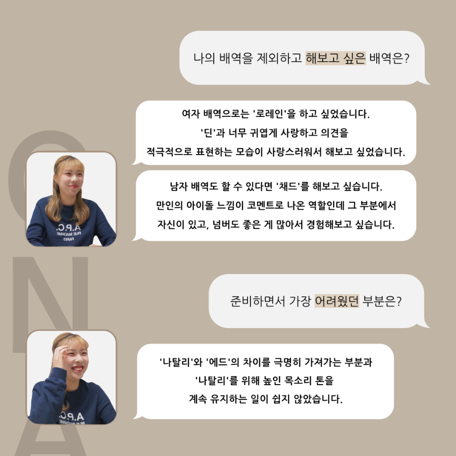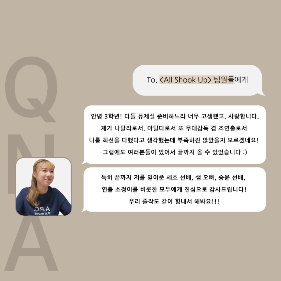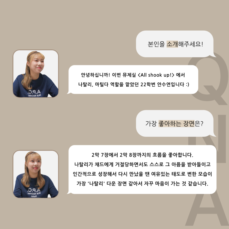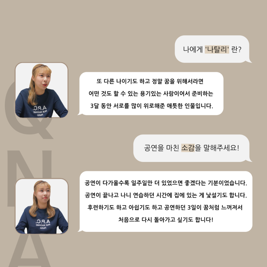본문 시작 홈으로 커뮤니티 학과소개 입학정보 교수소개 학과과정 커뮤니티 공연예매 안내 홈페이지가이드 포토갤러리 공지사항 포토갤러리 작품DB 동아리 학사일정 학생회 포토갤러리 페이스북 트위터 프린트 ‘품’ 위 있는 인 ‘터뷰’ - 뮤지컬 제작실습 <올슉업> 나탈리 안수연 카드 뉴스 연기예술학과 2537 2025-01-14 . 목록 이전‘품’ 위 있는 인 ‘터뷰’ - 뮤지컬 제작실습 <올슉업> 채드 연세호 카드 뉴스 다음 ‘품’ 위 있는 인 ‘터뷰’ - 뮤지컬 제작실습 <올슉업> 데니스정지운 카드 뉴스 담당부서 : 연기예술학과 담당자 : - 연락처 : 043-649-1733 최종수정일 : 2024-10-26 만족도조사 만족도 조사 이 페이지에서 제공하는 정보에 대하여 만족하시나요? 매우만족 만족 보통 불만족 매우불만족