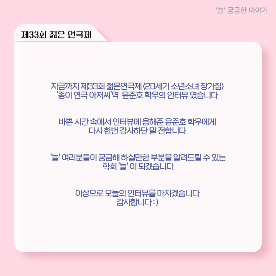 본문 시작 홈으로 커뮤니티 학과소개 입학정보 교수소개 학과과정 커뮤니티 공연예매 안내 홈페이지가이드 포토갤러리 공지사항 포토갤러리 작품DB 동아리 학사일정 학생회 포토갤러리 페이스북 트위터 프린트 ‘늘‘ 궁금한 이야기 - 젊은연극제 ‘20세기 소년소녀 창가집’ 종이연극 아저씨 役 < 윤준호 > 연기예술학과 1055 2025-08-28 . 목록 이전‘늘‘ 궁금한 이야기 - 젊은연극제 ‘20세기 소년소녀 창가집’ 사이토 役 < 박신현 > 다음 ‘늘‘ 궁금한 이야기 - 젊은연극제 ‘20세기 소년소녀 창가집’ 다큐pd 役 < 임재완 > 담당부서 : 연기예술학과 담당자 : - 연락처 : 043-649-1733 최종수정일 : 2024-10-26 만족도조사 만족도 조사 이 페이지에서 제공하는 정보에 대하여 만족하시나요? 매우만족 만족 보통 불만족 매우불만족