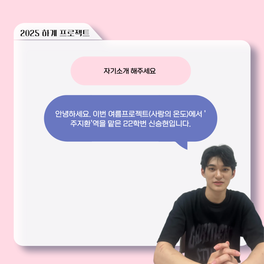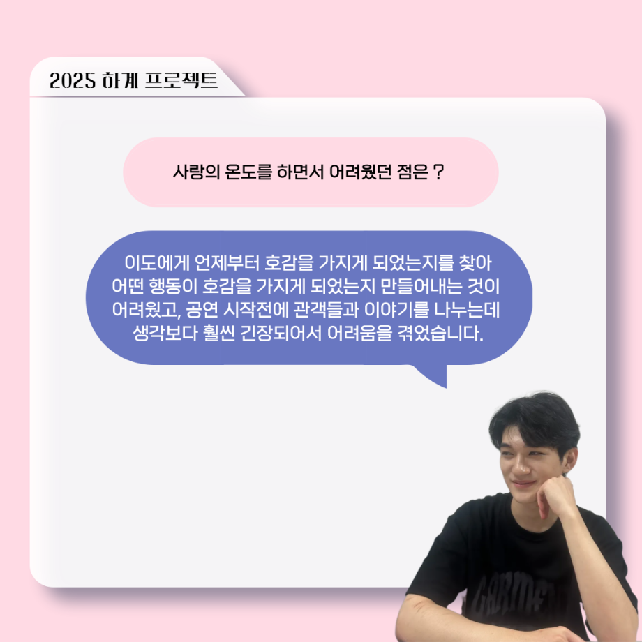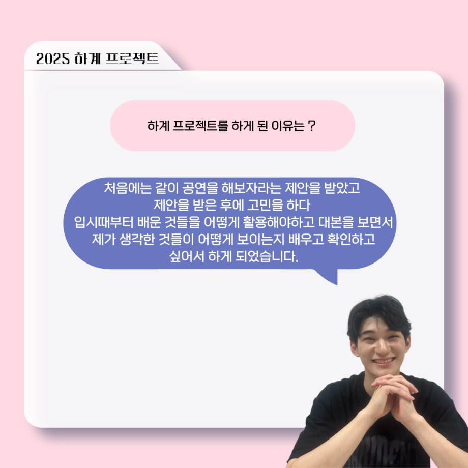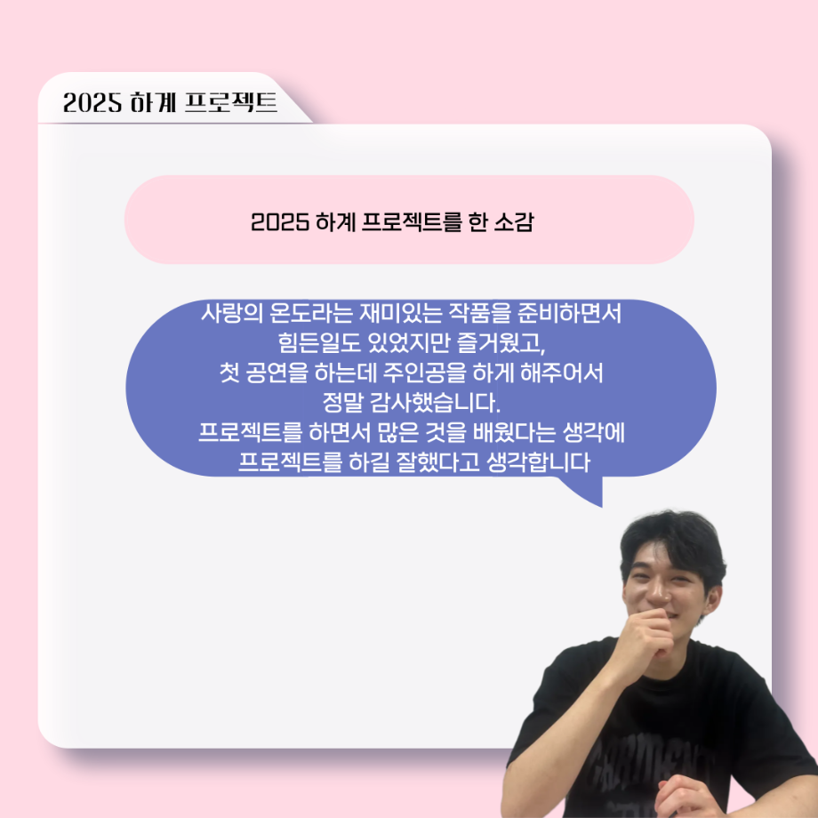 본문 시작 홈으로 커뮤니티 학과소개 입학정보 교수소개 학과과정 커뮤니티 공연예매 안내 홈페이지가이드 포토갤러리 공지사항 포토갤러리 작품DB 동아리 학사일정 학생회 포토갤러리 페이스북 트위터 프린트 ‘늘‘ 궁금한 이야기 - 하계 프로젝트 ‘사랑의 온도’팀 주지환役 < 신승현 > 연기예술학과 385 2025-11-11 . 목록 이전‘늘‘ 궁금한 이야기 - 하계 프로젝트 ‘사랑의 온도’팀 서이도役 < 함유진 > 다음 ‘늘‘ 궁금한 이야기 - 2025 졸업작품 ‘유랑극장’ 노풍찬役 < 김은혁 > 담당부서 : 연기예술학과 담당자 : - 연락처 : 043-649-1733 최종수정일 : 2024-10-26 만족도조사 만족도 조사 이 페이지에서 제공하는 정보에 대하여 만족하시나요? 매우만족 만족 보통 불만족 매우불만족