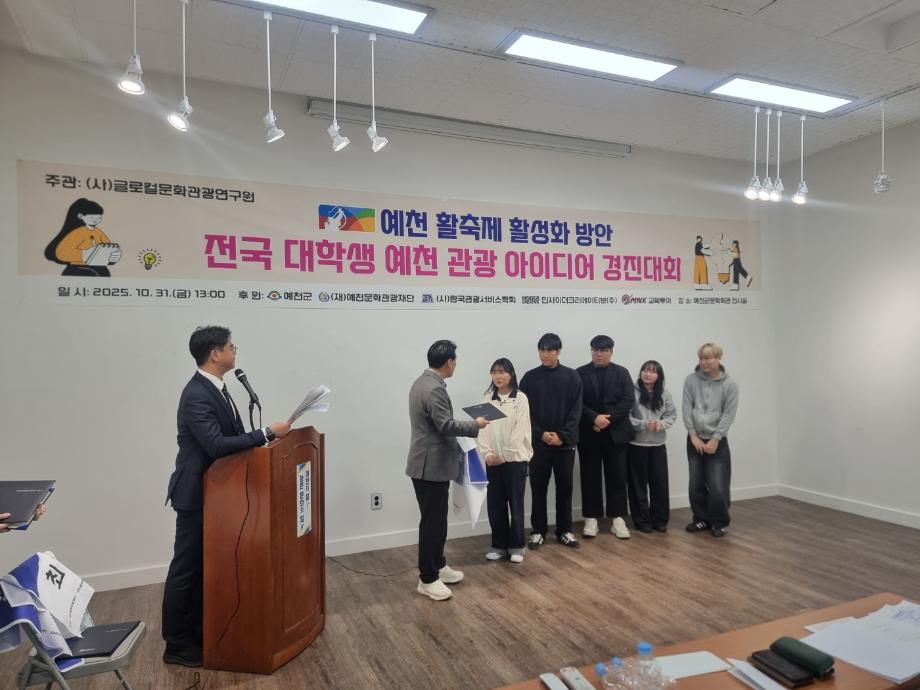 본문 시작 홈으로 학과소개 커뮤니티 학과소개 교육 홈페이지가이드 학과행사 학과장인사말 교수소개 학과행사 학과행사 페이스북 트위터 프린트 [예천 활축제 활성화 방안] 전국 대학생 예천 관광 아이디어 경진대회 호텔경영학과 221 2025-11-07 전국 대학생 예천 관광 아이디어 경진대회에서 3학년 장O빈, 이O준, 윤O빈 학생 2학년 정O찬, 김O민 학생이 우수상을 수상 하였습니다. 목록 이전학과 견학_2025년 제천국제한방천연물산업엑스포 다음 안동 하회마을 공모전 만족도조사 만족도 조사 이 페이지에서 제공하는 정보에 대하여 만족하시나요? 매우만족 만족 보통 불만족 매우불만족
